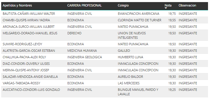 Ranking de ingresantes por nota obtenida mas alta según carrera profesional.